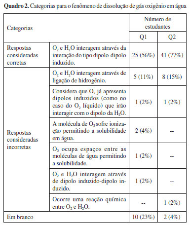 As quatro aulas sobre o tema, anteriormente descritas, foram gravadas em vídeo e transcritas em sua íntegra. As transcrições das aulas também constituem parte dos dados analisados, uma vez que as falas do professor foram confrontadas com as respostas. Explicações sobre a solubilidade do gás oxigênio em água foram solicitadas por se tratar de um importante fenômeno para a manutenção da vida aquática; fato que ocorre em nível submicroscópico devido à formação de um dipolo induzido. As moléculas de gás oxigênio, ao se aproximarem das moléculas de água, instantaneamente têm a formação de momentos de dipolo induzidos em suas moléculas, permitindo a solubilidade. Mas, esse fenômeno ocorre em uma pequena extensão, o que causa a baixa solubilidade. Para o oxigênio verifica-se a 1 atm e 25 °C uma solubilidade de 8,11 mg L-1.13 De posse das respostas, essas foram digitalizadas, lidas e categorizadas seguindo o esquema proposto por Bardin para a análise de conteúdo.14 As categorias de análise foram construídas levando-se em conta as explicações apresentadas para cada item das questões, desse modo, as respostas foram lidas algumas vezes e agrupadas em categorias pela autora do presente trabalho. Em seguida, as respostas e categorias foram apresentadas aos demais membros do grupo de pesquisa para validação. Após a categorização dos itens das questões organizou-se um quadro resumo com as características mais recorrentes das explicações obtidas. Os dados obtidos foram analisados e cruzados com as transcrições das aulas e com a forma como o conteúdo é apresentado nos livros didáticos sugeridos como referência de estudo para a disciplina, permitindo discutir possíveis relações entre as dificuldades apresentadas pelos estudantes e a forma como o conteúdo costuma ser apresentado.
