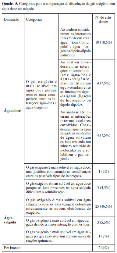Apenas 10 (19%) apresentaram uma justificativa mais completa de que na água salgada haverá uma competição entre interações dipolo-dipolo induzido entre água e oxigênio e íon-dipolo entre água e sais reduzindo a solubilidade do gás oxigênio. Resumindo, apenas 14 de 53 respostas (26%) podem ser consideradas corretas.