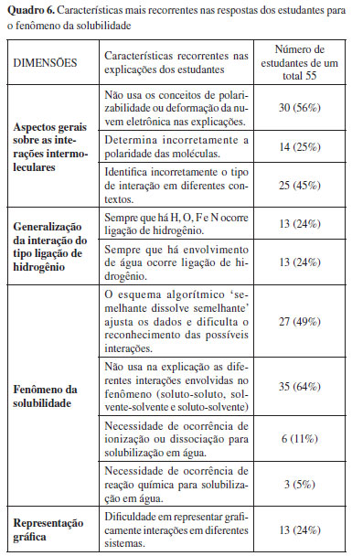 DISCUSSÃO Após a categorização das respostas para cada item das questões, elaborou-se um quadro resumo (Quadro 6) com as características que foram mais recorrentes nas explicações ao considerar aspectos fundamentais para uma completa compreensão do fenômeno no nível submicroscópico. Essas características mais gerais possibilitaram algumas inferências sobre o raciocínio usado pelos estudantes e suas relações com as aulas e materiais didáticos.