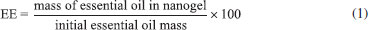 EXPERIMENTAL Materials The materials used for this research were the low molecular weight chitosan (DD= 75-85% and Mv= 50,000-190,000 Da), caffeic acid (98%) e N-(3-Dimethylaminopropyl)-N'-ethylcarbodiimide hydrochloride (EDC), ABTS (> 98%), DPPH (97%), trolox (97%) obtained by Sigma Aldrich. All chemicals used were of analytical grade. Methods Extraction of the essential oil The fresh leaves of L. origanoides collected in the municipality of Itumirim / MG (21° 12'58" S, 44° 51'21" W, 837 m) were used to extract the essential oil. In agreement with the proposed method,19 the hydrodistillation technique in a modified Clevenger apparatus was used for extraction. The hydrolate obtained after extraction was collected and centrifuged, which was collected and stored under refrigeration at 4 °C. Analysis of the essential oil The constituents of the eessential oil of L. origanoides were analyzed by means of gas chromatography equipped with a flame ionization detector (GC-FID) and gas chromatography coupled with mass spectrometry (GC-MS). The GC-MS analysis of the essential oil was performed with a chromatography Shimadzu CG-17A coupled to mass spectrometry QP 5000. The equipment equipped with a fused silica capillary column (30 m × 0.25 mm , film thickness 0.25 µm). For the detection, impact energy of 70 eV was used. Carrier gas was helium at a flow rate of 1 mL min-1. Injector temperature was set at 220 °C. The column programmed with initial temperature of 40 ºC, being added 3 ºC every minute until reaching 240 ºC; initial column pressure of 100.2 KPa; split ratio 1:10. Diluted samples (1% solution in hexane) of 1 µL. The compounds identification was based on comparison of their relative retention times with those of hydrocarbon mixture (C9H20 .......... C26H54) injection made under the same conditions as the essential oils, and by matching their arithmetic indexes with those obtained from databases of the Wiley library database 229 and published data libraries.20 The GC-FID analysis of the essential oil was performed using a gas chromatograph Shimadzu, model GC-2010, equipped with a RTX-5MS capillary column (30 m × 0.25 mm i.d., 0.25 µm film thickness). Nitrogen was the carrier gas, at a flow rate of 1.18 mL min-1. The injector and detector temperatures were set at 220 and 300 °C, respectively. The program used was 60 °C rising to 240 °C at a rate of 3 °C min-1, passing to a heating rate of 10 °C min-1 raised to 300 °C and finally remaining at that temperature for 10 min. Diluted samples (1/100, v/v, in hexane) of 1.0 µl were injected, split ratio 1:50 and pressure in the column of 115 KPa. Chitosan nanogel bound to caffeic acid synthesis Chitosan nanogel bound to caffeic acid was prepared as reported previously by Chen et al.. 21 First, 1.20 g of chitosan was dissolved in 100 mL of aqueous acetic acid (1% v/v) under magnetic stirring. Then, 85 mL of methanol was added, being the solution subsequently submitted ultrasonic bath at the frequency of 40 kHz, at room temperature. Subsequently, 1.10 g of caffeic acid and 1.68 g of EDC was mixed and dissolved in 20 mL of ethanol. After that, both solutions were mixed under 350 rpm stirred, following the reaction for 24 hours. After this period, the nanogel was submitted ultrasonic bath at the frequency of 40 kHz and the solution was adjusted to 8.5-9.0 using a solution of sodium hydroxide (1 mol L-1). The mixture was then centrifuged at 5100 rpm for 15 minutes to recover the precipitated nanogel, and subjected to a series of washes with distilled water until neutral pH. In the sequel, the nanogel was submitted to three washes with ethanol, the blend being centrifuged at 5100 rpm for 15 min. The obtained nanogel was placed for drying under vacuum at natural temperature in a desiccator containing silica gel. Lippia origanoides essential oil encapsulation The encapsulation of L. origanoides essential oil into (CS-CA) was performed using approximately 100 mg of CS-CA dissolved in 10 mL of aqueous acetic acid solution (pH = 3.5-4.0) under stirring. The phase dispersed was composed of L. origanoides essential oil in ethanol (1:1 mass/volume). Under 500 rpm stirring, the essential oil solution was dripped into the nanogel solution. After, the resulting mixture was sonicated to 40 kHz frequency, for 10 min at room temperature. Then, the nanogel containing the essential oil had the pH adjusted to 8.5-9.0 employing sodium hydroxide (1 mol L−1). Several washes with distilled water were performed in the precipitated material until neutral pH, and centrifuged at 5100 rpm for 15 min. Lastly, the precipitated (CS-CA) was transferred to a Teflon plate and placed for drying under vacuum at natural temperature in a desiccator containing silica gel. They were stored at 4 °C. Nanogel characterization by ATR-FTIR Characterizations of pure chitosan, caffeic acid and nanogel CS-CA were determined by ATR-FTIR. FTIR spectra were recorded with a PerkinElmer (Frontier Single Range-MIR) spectrometer, coupled with ATR module. The ATR-FTIR spectra of the samples in the spectral region 4000-650 cm−1, were obtained by accumulating 16 scans at 4 cm−1 resolution, using LiTaO3 detector. Nanogel characterization by SEM The morphology of the obtained dehydrated nanogel (CS-CA) and of dehydrated nanogel encapsulated with essential oil of L. origanoides (CS-CAEO) was observed with scanning electron microscopy SEM (LEO EVO 40 model). Some selected samples were immersed in liquid nitrogen and fractured on a cooled metal surface to internal structures visualization. Gold particles were deposited onto the powders with a Balzers SCD 050 evaporator. The morphological analyses were performed in 100x and 500x approximations, of the surface and fracture (cross section) of the material. Nanogel characterization by DLS The particle size of the nanogels CS-CA previously and after the incorporation of the essential oil of L. origanoides were measured by dynamic light scatteri