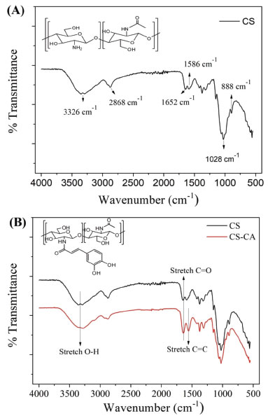 ![]() Figure 1. FTIR spectra of (A) chitosan and (B) chitosan-caffeic acid nanogel and chitosan