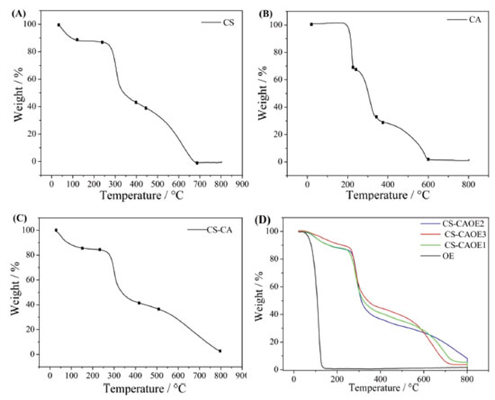 ![]() Figure 4. TGA curves of chitosan (A), caffeic acid (B), chitosan-caffeic acid nanogel (C) and chitosan-caffeic acid nanogel containing encapsulated essential oil (D)