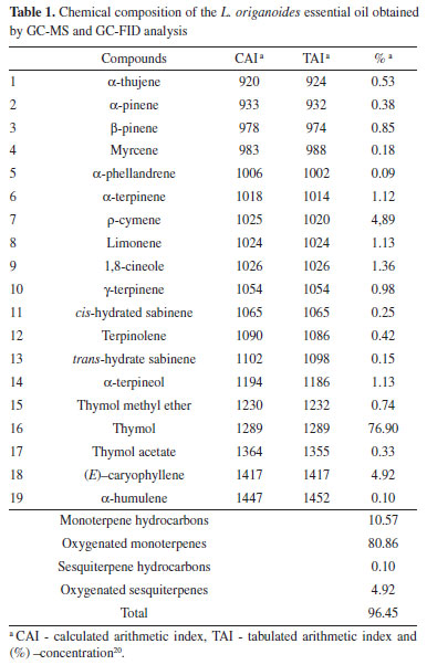 RESULTS AND DISCUSSION Lippia origanoides essential oil characterization and identification The essential oil GC-MS analysis revealed the presence of nineteen compounds, representing 97.91% of the essential oil chemical composition (Table 1). As shown in this table, thymol (78.20%), ρ-cymene (5.76%), (E)-caryophyllene (3.53%) and γ-terpinene (3.33%) were the major L. origanoides essential oil components.