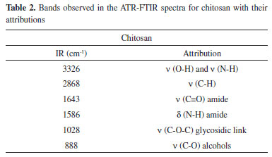 The ATR-FTIR identification of the binding between CS and CA (Figure 1B) was observed by the presence of the absorption band at 1552 cm-1 regarding the C=C stretching of aromatic ring. In addition, it was possible to observe the absence of the N-H deformation vibrations of chitosan amide II at 1586 cm-1. It was also possible to observe in the spectrum of CS-CA nanogel the reduction in the intensity of the absorption band in the region of 3326 cm-1, which corresponds the primary amine groups, while secondary amides were formed. In addition, it was possible to observe the broadening and increasing of intensity of the absorption band at 1643 cm-1, which corresponds to the C=O stretching vibrations of amide I. Results of the ATR-FTIR spectra of chitosan is shown in Figures 1A-B and described in Table 2.26,27,16