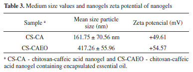 It is possible to observe on the nanogel surface (Figure 3A) the presence of irregular regions and well defined spherical cavities, distributed throughout the material. However, these characteristics were not observed in the control material (Figure 2), which presented an uniform external structure, without cracking or pores, indicating the formation of a dense and compact structure. On Figure 3B it is possible to see the presence of a larger number of pores and spherical cavities in the sample transversal section, which are well dispersed into the CS-CA matrix. These results indicate that the oil droplets were adhered effectively within the CS-CA matrix. Almeida et al.15 reported similar results when the L. origanoides essential oil was incorporated in nanogels of chitosan-ferulic acid. Determination of Particle Size and Zeta Potential from nanogels The dynamic light scattering (DLS) technique was used to determine the mean particle size of CS-CA nanogel and its Zeta potential before and after the incorporation of the essential oil of L. origanoides. Table 3 presents the results obtained.