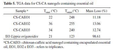 CONCLUSIONS The CS-CA nanogel was synthesized by the formation of the chitosan-caffeic acid bond. The interaction between CA and CS was confirmed by spectroscopy (ATR-FTIR) and thermochemical analysis (TGA). Through the gravimetric analysis it was verified that the synthesized nanogel presents an efficacy in the L. origanoides essential oil encapsulation¸ that among its main constituents, compounds such as thymol and ρ-cymene are present. This result was confirmed by morphological analysis, since after the incorporation of the essential oil by the CS-CA material, there were changes in its structure. On the surface and cross-section of the CS-CAEO sample the presence of irregular regions and well-defined spherical cavities was observed, which was not observed in the control sample. These results indicated that the droplets of essential oil were adhered effectively inside the matrix. The size distribution analysis showed that only with the incorporation of the essential oil is it possible to carry out the measurement of the CS-CA particle size. In relation to the antioxidant activities, it was observed that these were superior after the incorporation of the essential oil by the nanogels. It is important to note that for the nanogel of CS-CAEO, the value was even higher than that presented by pure essential oil.