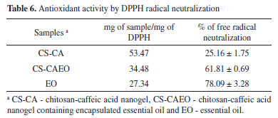 For all the CS-CAEO samples, it was verified that the temperature that starts the volatilization of the essential oil (Tonset) and ends (Tendset), occurred at higher temperatures than in the pure essential oil (Table 5). Inferring that the interaction between the nanogel and the essential oil made it difficult to volatilize. These results confirm those obtained by MEV, that most of the L. origanoides essential oil is stably incorporated into the CS-CA nanogel. Encapsulation efficiency (EE) by Gravimetric Analysis After the TGA analysis (Figure 4), it was possible to determine the volatilization temperature of the L. origanoides essential oil, which occurred between 22-255 ºC, when incorporated to the CS-CA nanogel. By means of these results, the temperature used in the gravimetric analysis was determined. The temperature of 220 °C was selected, since at this temperature only the essential oil would be volatilized, and no events related to CS-CA nanogel degradation were observed (Tables 3 and 4). Thus, the values related to the encapsulation efficiencies of the CS-CA nanogel (EE) were calculated according to Equation 1. The CS-CA nanogel exhibited an average encapsulation efficiency of 45 ± 2%. With base on the encapsulation efficiencies of L. origanoides essential oil obtained by other matrices in recent works, it is observed that the obtained result in this work was satisfactory. Damasceno et al.6 evaluated the efficiency of pure chitosan and ρ-coumaric chitosan-acid nanogel by gravimetric analysis to encapsulate the L. origanoides essential oil, obtaining results of 37 ± 2 and 42 ± 1, respectively. Whereas, Almeida et al.15 using the thermogravimetric analysis evaluated the ability of the nanogel of chitosan-ferulic acid to encapsulate the L. origanoides essential oil. The authors obtained 20% EE in the proportion of (3.9: 9.9) of (ferulic acid: EDC), 12.0% (2.0: 5.0), 10.0% (1.0: 2.5) and 13.4% (0.5: 1.3).15 These contents are inferior to the one found in this study of 45 ± 2, which shows the potential of the CS-CA nanogel to satisfactorily encapsulate the L. origanoides essential oil. Antioxidant activity by DPPH assay The assay based on neutralization of the DPPH radical has been widely used to determine the ability of neutralizing free radicals.32 In reaction processing, antioxidants react with DPPH, reducing a number of DPPH molecules, equal to the number of hydrogen radicals that may be available. In the neutralization process of the DPPH free radical it is possible to visualize a discoloration of the solution from purple to yellow.33 The antioxidant activities found for L. origanoides EO and CS-CA nanogel with and without incorporated essential oil are shown in Table 6. The results were expressed in mg sample/mg DPPH and also in % neutralization of the free radicals.