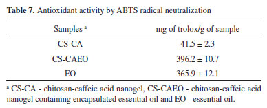 It can be observed from the results (Table 6) that the CS-CA nanogel already had an antioxidant activity, probably due to the presence of the caffeic acid in the chitosan structure. Aytekin et al.34 showed that the highest antioxidant activity occurred in the chitosan derivatives containing the highest proportion of caffeic acid, confirming that the antioxidant capacity of chitosan was enhanced by its conjugation with the acid. Damasceno et al.6 in a similar study with the modification of chitosan with p-coumaric acid, obtained by the DPPH test a lower antioxidant activity of 4.34 ± 0.20%, in comparison to the obtained result in this work (Table 6). Confirming the satisfactory antioxidant capacity of the modified chitosan with the caffeic acid. After the incorporation of the essential oil in the CS-CA nanogel it is observed that there was a significant increase in the % of neutralization of the free radicals comparing with the material without the presence of oil. It is important to note that the essential oil encapsulation in the CS-CA nanogel showed the best result, since the % neutralization values of the free radicals were close to those found for the pure L. origanoides essential oil (Table 6). The relevant antioxidant activity presented by EO L. origanoides is mainly due to its main constituents. The constituents such as thymol and carvacrol are recognized as excellent bioactive molecules, being able to reduce the formation of free radicals.35 In this way, it can be observed that the increase in the antioxidant activity of the materials is related to the incorporation of the essential oil by the synthesized materials, as well as the formation of chemical bond between the chitosan and the caffeic acid, since this compound also presents activity. Antioxidant activity by ABTS assay The ABTS radical scavenging assay has also been widely used to evaluate antioxidants. In this assay, the ABTS moiety measures the neutralizing ability of free radicals by discoloring the ABTS blue reagent. The decrease in ABTS concentration is linearly dependent on the antioxidant concentration, including trolox as a reference antioxidant.36 The antioxidant activities found for EO L. origanoides and CS-CA nanogel with and without incorporated essential oil are shown in Table 7. The results were expressed as mg trolox/g sample.