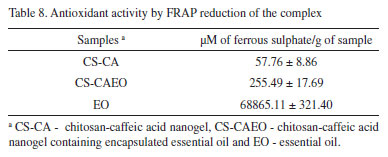 By Table 7 it is possible to see that after the essential oil incorporation into the CS-CA nanogel there was a significant increase in the antioxidant activity. The value related to the antioxidant activity of the CS-CA nanogel (Table 7) was lower than that presented by the CS-CAEO nanogel after the incorporation of the essential oil. By means of the obtained results, it is observed that after the encapsulation of the L. origanoides essential oil by the material, there was a significant increase of the antioxidant activity of the resulting material. Being important to emphasize that for the CS-CAEO nanogel, the value was even higher than that presented by pure essential oil (Table 7). Antioxidant activity by FRAP assay Some compounds are inactive in the DPPH and ABTS assay but exhibit high antioxidant activities in the FRAP assay. Thus, the evaluation of these samples for their antioxidant behavior by the FRAP assay is of significant importance. The evaluation of antioxidants by this method is based on the reduction of the complex (Fe3+-TPTZ) by antioxidants to the ferrous form (Fe2+-TPTZ).37 The Table 8 shows that after the incorporation of the essential oil into the CS-CA nanogel there was a substantial improvement in its antioxidant capacity. On the other hand, it is observed that by encapsulating the components present in the essential oil by means of the interactions with the polymer (Table 8), it reduced its availability for iron reduction by giving a low value relative to the pure L. origanoides essential oil.
