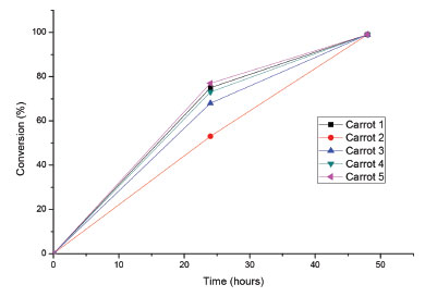 ![]() Figure 2. Conversion performance for each carrot tested. Experimental conditions: 100 mg of 1, 5 g of carrot, 50 mL of H2O. Conversion determined by GC