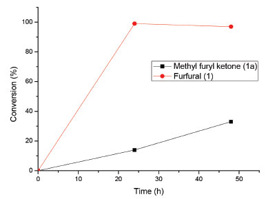 ![]() Figure 3. Reactions containing furfural and 2-furyl methyl ketone. Experimental conditions: 21 mmol L-1 of substrate, 5 g of carrot, 50 mL of H2O. Conversion determined by GC