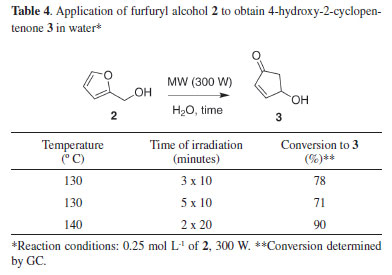 Figure 3 clearly shows that the reaction with aldehyde 1 performs better than that with the corresponding ketone 1a. This result can be explained either by the difference in reactivity between aldehydes and ketones, by their solubility difference in water, or by both. In our view, it appears that the solubility of the substrate in water plays a more critical role than the reactivity difference between the functional groups (ketone vs aldehyde). In a previous study, reduction of N,N-dimethylamino benzaldehyde using carrots was relatively slow, and the data corroborated the low solubility of this compound in water (0.3 g L-1).16 However, furfural, another aldehyde, performs better mainly because of its high solubility (> 79 g L-1 at 20 ºC)17 in water compared with that of the corresponding ketone 1a, which is less soluble (39 g L-1). A similar behavior of a higher reactivity of aldehydes than ketones was observed using different plants as biocatalysts.18 The solubility issue of the substrate was explored recently.19,20 However, furfural is industrially produced at a large scale; thus, we believe it is best to keep the reaction system as simple as possible (water and carrot only). Piancatelli rearrangement One of the several applications of furfuryl alcohol is the conversion to the 4-hydroxy-2-cyclopentenone 3 by Piancatelli rearrangement.21 Reiser and coworkers developed a catalyst-free protocol by heating an aqueous solution of furfuryl alcohol (aprox. 0.25 mol/L) at 220 ºC and 15.5 bar under microwave irradiation.22 Considering the present sustainable reduction of furfural in water, we investigated if the rearrangement can be conducted directly from the bioreduction reaction. Initial attempts to achieve such subcritical conditions using commercial furfuryl alcohol in water (0.25 mol L-1) failed in our hands. To our surprise, however, we observed the formation of the desired cyclopentenone even at lower temperatures. The results are summarized in Table 4.