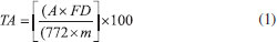 Método para a determinação do teor de antocianinas O teor de antocianinas (TA) é calculado em porcentagem (%) em relação à cianidina-3-glicosídica42 utilizando a Equação 1, a qual é aplicada quando o solvente utilizado é MeOH/HCl, 1%,42 sendo A o valor da absorbância medida em 528 nm, FD o fator de diluição, 772 a absorbância específica da cianidina-3-glicosídica e m a massa da amostra (g). A extração foi realizada utilizando 0,1000 ± 0,0030 g de material vegetal e 5,0 mL de metanol acidulado com HCl a 1% (MeOH/HCl, 1%). Esse método permite a extração completa de antocianinas.16 O extrato foi filtrado e ajustado para 10 mL com MeOH/HCl, 1% (w/w). As extrações foram realizadas em triplicata, isto é, para três conjuntos de amostras de cada flor. Para cada conjunto de amostras foi determinado o teor de antocianinas de acordo com o método descrito por Sandre e col.,42 o qual utiliza MeOH/HCl, 1%. A absorbância foi coletada logo após a extração para minimizar os efeitos de fotodegradação. ![]()