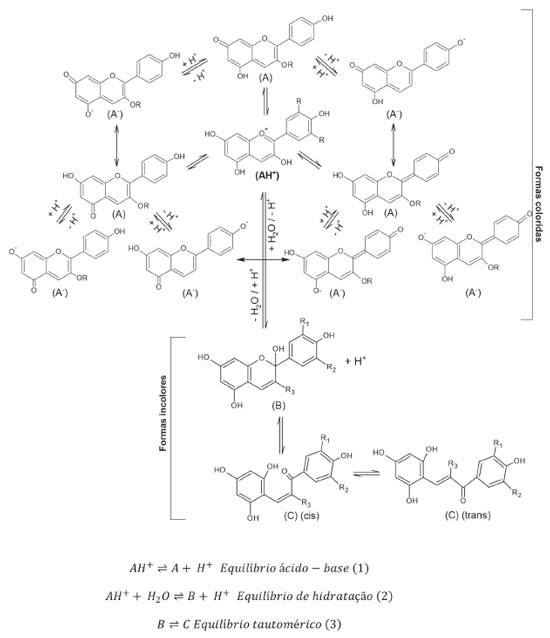 O pH é um dos fatores mais importantes para definir a pigmentação das flores ou frutos, pois a acidez do vacúolo celular varia entre 2,5 e 7,5 sobre as antocianinas. De acordo com Brouillard,11 entre pH 1 e 2 o cátion flavínico (AH+) é provavelmente o único responsável pela pigmentação enquanto entre pH 3-4 tanto o cátion flavínico como as bases quinoidais neutras (tautômeros neutros) contribuem para a cor. Já entre pH 4-6 as bases quinoidais neutras são majoritariamente as responsáveis pela coloração observada, enquanto em pH 7 a espécie carregada negativamente é tão estável quanto a base quinoidal. As bases quinoidais neutras (A) ou negativamente carregadas (A-) apresentam estabilidade em pH 10. Nas soluções aquosas ácidas existem quatro espécies de antocianinas em equilíbrio:11 i) a base quinoidal (A ou A-); ii) o cátion flavínico (AH+); iii) a pseudobase ou carbinol (B); e iv) a chalcona (C). A representação esquemática da interconversão entre essas quatro estruturas é apresentada no Esquema 1. As antocianinas são corantes naturais12 moderadamente hidrossolúveis, estáveis em meio ácido, encontradas nos vacúolos de muitas plantas.13 Elas são responsáveis pela cor vermelho à azul de muitas flores, frutos e legumes.14 Há muitas antocianinas já identificadas na natureza devido ao número de variações possíveis com mono- ou diglicosídeos e de mono-, di- ou trissacarídeos. As antocianinas encontram-se associadas a moléculas de açúcares e, quando livres desses açúcares, são denominadas antocianidinas (agliconas),15,16 que além de atuarem como antioxidantes e agentes quelantes ainda se interconvertem (Esquema 1) alterando a coloração do meio em função da alteração de pH.17 Algumas antocianidinas são apresentadas na Figura 1.