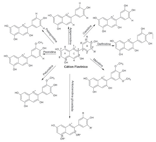 ![]() Figura 1. Representação de algumas antocianidinas. Sendo R* uma molécula de açúcar16,21