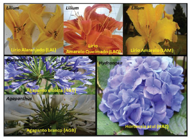 ![]() Figura 2. Imagem das flores estudadas, nomes comuns (em amarelo) e científicos (em itálico)