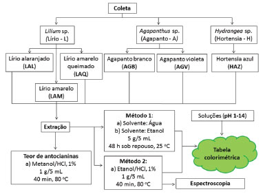 PARTE EXPERIMENTAL Para o cálculo do teor de antocianinas em relação à cianidina-3-glicosídica, utilizou-se metanol acidulado com HCl a 1% como solvente extrator.42 Em seguida, para investigar o comportamento dos extratos de Lilium, Agapanthus e Hydrangea em diferentes faixas de pH, dois métodos de extração foram empregados, visando determinar o método e a espécie de planta mais adequada para a obtenção do extrato vegetal e consequentemente das tabelas colorimétricas, que indicam o comportamento de cada extrato entre pH 1-14. Método 17 - utilizando etanol e água e Método 216 - utilizando etanol acidulado com HCl a 1%. Materiais, reagentes e equipamentos Os reagentes e os solventes utilizados foram de grau analítico: etanol (Neon, 99,5%), metanol (Neon, 99,8%), hidróxido de sódio (Neon, 99,0%) ácido clorídrico (Vetec, 37,0%), água destilada (< 10 µS cm-1), pétalas de (a) lírio (Lilium sp.) nas cores alaranjado (LAL), amarelo-queimado (LAQ) e amarelo (LAM); (b) agapanto (Agapanthus sp.) nas cores branco (AGB) e violeta (AGV); (c) hortensia (Hydrangea sp.) azul (HAZ), pHmetro digital de bancada (pHS-38W microprocessor) utilizando soluções tampão (Vetec) pH 4,00 e pH 7,00 para calibrar o pHmetro, espectrofotômetro PerkinElmer Lambda 365. As flores foram coletadas no jardim do campus da instituição. A Figura 2 apresenta a imagem das flores utilizadas para os testes realizados.