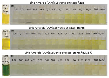 Para os extratos de LAL e LAM, os resultados obtidos por espectroscopia na região do visível (Figura 4) indicam que essas flores sejam ricas em compostos da classe dos carotenoides49 tais como luteína e β-caroteno, presente em extratos de lírios.45 O β-caroteno apresenta três bandas de absorção características na região de 417, 450, 478 nm46 e a luteína na região de 421, 445 e 474 nm,47 muito próximas às regiões observadas neste trabalho para os extratos de LAM (em 422, 447 e 473 nm) e LAL (em 422, 447 e 479 nm). Entre as Figuras 5-10 são apresentadas as tabelas colorimétricas obtidas a partir das extrações realizadas. Em todas as figuras, o frasco à esquerda apresenta as colorações dos extratos das pétalas de cada espécie de flor em cada solvente e o pH das soluções está indicado em cada frasco em ordem crescente, da esquerda para a direita.