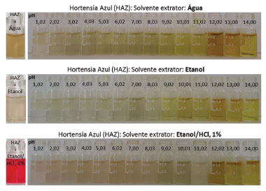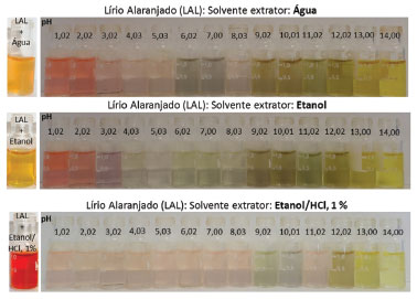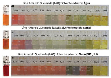 CONCLUSÃO Neste manuscrito propõe-se uma atividade experimental utilizando extratos de flores para abordar o tema ácido-base, sugerindo que dentre as flores cujo comportamento foi investigado os extratos recomendados como indicadores ácido-base alternativos sejam os extratos de lírio alaranjado (LAL) e amarelo queimado (LAQ). O alto teor de antociacinas determinados em LAL e em LAQ permitiu obter alterações significativas nas colorações das soluções entre pH 1-14. Além disso, a atividade contribui para a reflexão dos estudantes sobre "quais plantas posso usar?". A atividade deixa claro que plantas com elevado teor de antocianina são as mais próximas ao vermelho, sendo as concentrações determinadas em relação à cianidina-3-glicosídica em ordem crescente de 0,07 (± 0,03) para LAM < 0,21 (± 0,03) para AGB < 1,72 (± 0,13) para AGV < 1,83 (± 0,47) para HAZ < 2,87 (± 0,52) para LAL < 9,55 (± 0,46) para LAQ. O melhor solvente para a extração é etanol/HCl 1%, por provocar as maiores variações e intensidades de cor obtidas e, consequentemente, os melhores resultados experimentais do ponto de vista colorimétrico. Contudo, as flores investigadas LAL e LAQ apresentaram os maiores teores de antocianinas e as maiores alterações colorimétricas quando houve variação do pH da solução. Tendo esta atividade caráter inter e multidisciplinar, a construção de mapas conceituais torna-se uma estratégia interessante do ponto de vista pedagógico. Assim, a partir desta atividade experimental utilizando extratos de Lilium sp., Agapanthus sp. e Hydrangea sp. espera-se contribuir na elaboração ou na realização de atividades experimentais em cursos que demandam Química em sua matriz curricular.