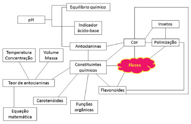 Os extratos de LAM e AGB, independentemente do solvente extrator, apresentam o mesmo perfil, sendo: a) incolor até pH acima de 10,01 para os extratos de AGB; b) incolor acima de pH 8,03 para os extratos de LAM; e c) amarelas após pH 11,02 para extratos de LAM e AGB. Esse comportamento provavelmente se deve ao baixo teor de antocianinas determinado no extrato das flores de LAM de 0,07% e de 0,21% no extrato das flores de AGB. Assim, os carotenoides presentes, especialmente β-caroteno e/ou luteína,49 promovem a visualização de soluções incolores ou amarelas. Esses carotenoides apresentam estabilidade frente às mudanças de pH do meio.36,58,59 Conforme Brouillard,11 soluções aquosas contendo antocianinas com valores de pH variando entre 1-14 podem resultar na produção de todas as cores do arco-íris. A partir das alterações visuais, fica claro que um grande número de reações deve estar envolvido no aparecimento, bem como no desaparecimento, de tantas cores. Isso é explicado pela presença das espécies H+, OH- e H2O, devido à alta reatividade com as antocianinas,11 que são corantes naturais. Dessa maneira, verifica-se que a extração das antocianinas responsáveis pela variação de pH observada nas tabelas colorimétricas, apresentadas nesta atividade experimental, ocorre de forma mais eficiente quando o meio é acidulado e na presença de calor. Também se observa que quanto mais próxima ao vermelho for a tonalidade das pétalas, maior a concentração de antocianinas e consequentemente mais interessante será a atividade aos estudantes, pois amplia o número de cores observadas com a variação do pH do meio. O uso de extrato de plantas apresenta vantagens durante o processo de ensino e aprendizagem,60 pois quando a transmissão da informação acontece através dos canais verbal e visual a aprendizagem torna-se potencialmente mais efetiva.61 Podemos destacar alguns pontos positivos desta atividade e do método proposto: i) valorização da grande variedade da flora, a qual varia de região para região, possibilitando a realização de uma atividade interdisciplinar com os estudantes; ii) o baixo custo para a execução da atividade; iii) as flores, utilizadas nesta atividade experimental, são recursos renováveis; iv) o processo de extração é simples. Esta atividade experimental ainda destaca a importância do uso de etanol acidulado, solvente clássico para a extração completa de antocianinas,16 permitindo também substituir indicadores clássicos de pH por indicadores alternativos de pH em realidades escolares que os indicadores clássicos de pH não estão disponíveis. Essas substituições contribuem para fortalecer os conceitos de química verde,62 permitindo abordar conceitos de sustentabilidade e ambiente, minimizando a geração de resíduos tóxicos. Essa atividade experimental proposta contribui para aumentar o conhecimento sobre o comportamento de plantas de diferentes regiões do Brasil frente às variações de pH do meio, contribuindo para que independente da realidade escolar o professor possa abordar os conceitos de química envolvidos nessa atividade a partir de um corpo teórico que oriente a investigação proposta. Ao final desta atividade experimental, propõe-se o mapa conceitual apresentado na Figura 12. Ele demonstra a integração dos conceitos das áreas de química, biologia, matemática e física. Choi e Park definem e destacam que ser multidisciplinar significa abordar o conhecimento de diferentes disciplinas mantendo-se dentro dos limites de cada uma. Já a interdisciplinaridade analisa, sintetiza e harmoniza tópicos de cada disciplina em um todo coordenado e coerente.63