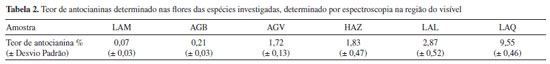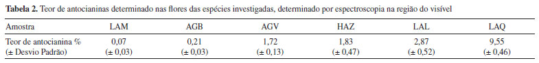 RESULTADOS E DISCUSSÃO O teor de antocianinas foi determinado a partir das flores de Lilium sp., Agapanthus sp. e Hydrangea sp. utilizando a Equação 1 e indica a porcentagem de antocianinas em relação à cianidina-3-glicosídica. O lírio amarelo queimado (LAQ) foi a amostra que apresentou o maior teor de antocianinas, enquanto o lírio amarelo (LAM) apresentou o menor teor de antocianinas, conforme apresentado na Tabela 2, sendo que em ordem crescente temos: LAM < AGB < AGV < HAZ < LAL < LAQ.
