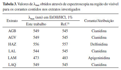 Sabe-se que entre vegetais, flores e frutos as colorações de vermelho a violeta são derivadas principalmente de uma classe de flavonoides denominada antocianinas.44 A partir da Tabela 2 observa-se que dentre as flores testadas, as amarelas e as brancas são as que apresentaram os menores teores de antocianinas. As flores investigadas com colorações mais próximas ao vermelho apresentaram os maiores teores de antocianinas (LAQ e LAL) e as flores violetas e azuis (AGV e HAZ) apresentaram teores intermediários de antocianinas. Existem principalmente três antocianinas que estão presentes em plantas superiores: pelargonidina, cianidina ou delfinidina e seus derivados, no entanto, muitas espécies de plantas acumulam flavonóis ou flavonas, além de antocianinas.45 A literatura descreve que diferentes espécies vegetais apresentam diferentes teores de antocianinas e que a utilização da espectroscopia de UV-Vis na análise de extratos permite que os estudantes realizem a interpretação de resultados com precisão chegando a conclusões razoáveis.16,21,22,46,47 As antocianinas são responsáveis pela alteração de coloração do meio mediante alteração do pH da solução.7,25,26,48 Considerando-se os valores de absorbância máxima (λmax), os resultados obtidos neste trabalho são coerentes com o trabalho de Harborne21 na identificação de cianidina, nesse caso presente nos extratos de LAQ, LAL, AGV e AGB; de delfinidina, presente no extrato de HAZ, e apigeninidina, no extrato de LAM (Tabela 3, Figura 4). As antocianidinas têm absorbância na região do ultravioleta (UV) e no visível do espectro (Vis), mas a intensidade de absorção no ultravioleta também é atribuível a outros compostos presentes no extrato, dessa forma, os espectros foram coletados entre 400 e 700 nm.22