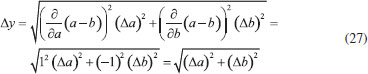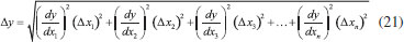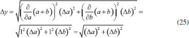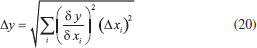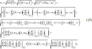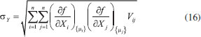 A propagação de incerteza per se Após este pequeno introito sobre o TCL, podemos ir agora diretamente para a propagação de incerteza. Seja, então, Y uma variável calculada como função de várias variáveis aleatórias (X1, X2, ., Xn). ![]() E considere-se que estas variáveis possuem uma distribuição normal de média µi e desvio padrão σi conhecidos. Se os desvios padrão σi forem suficientemente pequenos, a função f pode ser desenvolvida numa série de Taylor em torno dos valores médios {µi} e truncada nos termos lineares.3 ![]() Desta forma os parâmetros da variável aleatória Y podem ser facilmente determinados: a) média: ![]() E como: ![]() Temos que: ![]() b) desvio-padrão (lembrar que: (a + b)2 = a2 + 2ab + b2): ![]() ou seja: ![]() onde: ![]() Onde V é a matriz de variância-covariância de uma função Y. Na prática, esta matriz infere como as diferentes variáveis interferem entre si, ou seja, quantifica o grau de não-independência. A equação 16 também aparece elegantemente representada na literatura, como:4 ![]() onde g é um vetor e gT é o vetor transposto. Se assumirmos que as variáveis são independentes, ou seja, sem covariâncias e Vij for igual a 1. ![]() Para simplificarmos, vamos considerar que σY = Δy: ![]() E esta é talvez a equação mais relevante do tópico deste manuscrito, a equação de propagação de erros. Se o leitor deste artigo não a decorar, por favor coloque-a em grande na parede, colada com fita-adesiva. Para estudantes que ainda não tenham feito Cálculo, é o mesmo que: ![]() Estão a ser usadas derivadas parciais, ou seja, Vejamos o que se passa quando aplicamos a equação de propagação de incertezas a alguns dos casos principais: Na multiplicação com uma constante: ![]() (sendo k uma constante), teremos que (lembrar que: ![]() Na adição: ![]() teremos que (lembrar que: ![]() Na subtração: ![]() teremos que: ![]() Na multiplicação: ![]() teremos que: ![]() Na divisão: ![]() teremos que: ![]() Com potências: ![]() (sendo k uma constante), teremos que (lembrar que: ![]() Com logaritmos: ![]() (sendo k uma constante), teremos que (lembrar que: ![]() Estas equações estão resumidas na Tabela 1.