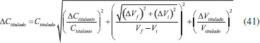 Mas é importante perceber que a equação de propagação de erros não se aplica apenas em casos de aplicação mais trivial como os descritos na tabela. Pode ser sempre aplicada. Seguem alguns exemplos (o autor desafia o leitor mais interessado a fazer a demonstração por si mesmo antes de verificar a mesma em informação suplementar): ![]() Existem já, vários sites para calcular a incerteza,5-7 e, inclusive, aplicativos para dispositivos móveis. Um bom exemplo, é o aplicativo para Android 'Error Propagation Calculator' criado por Julian Wien, quando estudava na Universidade de Würzburg na Alemanha.8 Imagine que temos de preparar um litro de uma solução tampão de fosfato, pH 7.4, 0,1 mol L-1. Fazemos as contas e chegamos à conclusão que temos de pesar 20,210 g de hidrogenofosfato de sódio heptahidratado (m1), massa molar de 268,07 g mol-1 (MM1), e 3,395 g dihidrogenofosfato de sódio monohidratado (m2), massa molar de 137,99 g mol-1 (MM2). A incerteza da concentração (ΔC) é o seguinte (a demonstração encontra-se na informação suplementar): ![]() Para esta fórmula não foi levado em conta a possível adição de ácido ou base para acertar o pH. Se optarmos por fazer a solução usando uma balança analítica (± 0,1 mg) e um balão volumétrico classe A (± 0,3 mL) teremos de concentração com a respetiva incerteza: (0,09999 ± 0,00003) mol L-1. Se pelo contrário, for utilizada uma balança semi-analítica (± 1 mg) e um béquer comum (± 25 mL), teremos no final: (0,100 ± 0,002) mol L-1. Normalmente, o recurso a uma solução tampão é apenas para tamponar o meio, não é muito importante ter uma concentração muito precisa. Como tal, é justificado que se use um béquer e uma balança mais acessível. Deste modo, não só a preparação da solução é mais rápida e simples mas também não utilizamos material mais frágil. Pensemos agora num exemplo antagónico. A titulação de 25 mL (Vtitulado) de um ácido forte monoprótico com hidróxido de sódio de concentração (Ctitulante) conhecida, (0,1223 ± 0,0002) mol L-1. ![]() Se a titulação (Vf de 42 mL e Vi de 9 mL) for feita de forma normal com uma bureta (ΔVf = ΔVi = 0,02 mL) e o titulado for medido com uma pipeta volumétrica (ΔVtitulado de 0,02 mL), teremos que: (0,1614 ± 0,0003) mol L-1. Se, porventura a "titulação" for feita com menos cuidado utilizando uma proveta (ΔVf = ΔVi = 1 mL) e o titulado for medido com um béquer (ΔVtitulado de 3 mL), teremos que: (0,16 ± 0,02) mol L-1, ou seja mais de 10% de incerteza. Neste caso, querendo conhecer a concentração do ácido com precisão faz mais sentido usar a bureta e uma pipeta volumétrica. Estes dois exemplos demonstram que, sabendo como calcular a incerteza, podemos pensar como melhor realizar os experimentos, decidindo investir, ou não, em recursos para aumentar a precisão da nossa análise. É importante entender que é relevante não só calcular a incerteza como compreender a incerteza.