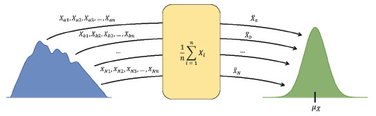 ![]() Figura 1. Representação esquemática do TCL. É calculada a média de cada uma das diferentes amostras retiradas da população não normal (no lado esquerdo). A distribuição dessas mesmas médias é, interessantemente, normal (no lado direito)