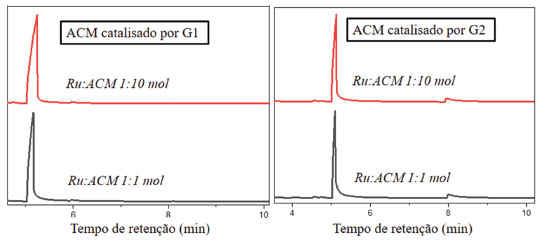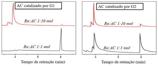 ![]() Figura 2. Cromatograma dos produtos das reações de metátese de AC catalisadas por G1 e G2. Condições reacionais: razão Ru:substrato de 1:1 ou 1:10 mol, 50 ºC por 24 h