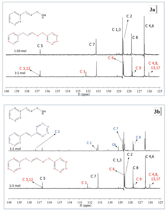 ![]() Figura 3. (a) Espectros de RMN de 13C {1H} para os produtos das reações de metátese de AC catalisada por G1, com Ru:AC de 1:10 e 1:1 mol. (b) Espectros de RMN de 13C {1H} para os produtos das reações de metátese do AC com G2 (espectro com numeração em azul) e G1