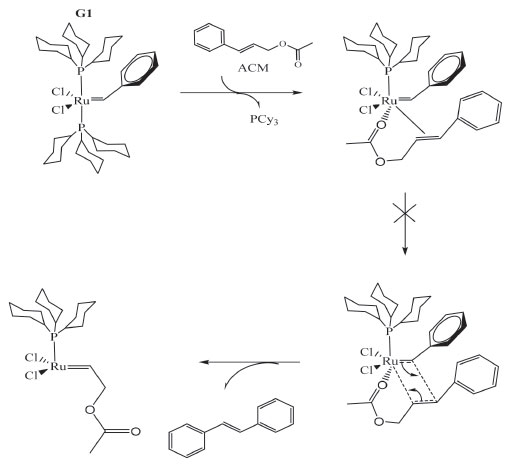 Acredita-se que houve coordenação do oxigênio C=O do grupo carboxílico ao metal simultaneamente à coordenação da olefina, o que levaria a um sistema estabilizado, com uma etapa a mais para formação do produto. É um entendimento da comunidade científica que a formação de um sistema quelato pode dificultar a metátese de olefinas, porque o sistema perde mobilidade, fica rígido.8 Esse efeito, associado ao pouco impedimento estérico de G1 gerado pela PCy3, aumentou a estabilidade do coordenação adicional do C=O, impedindo assim a continuação da etapa de formação do intermediário metalociclobutano e posterior formação do produto esperado-estilbeno (Figura 2S). Da mesma forma como explicado anteriormente, acredita-se na coordenação do oxigênio C=O de ACM ao metal simultaneamente à da dupla olefínica do substrato, formando um sistema quelato. No entanto diferente de G1, que o ligante ancilar PCy3 aumentou a estabilidade da coordenação do C=O, a presença do grupo NHC de G2 diminuiu a dupla coordenação, somado ao efeito sinérgico trans, proporcionaram a continuidade da etapa da reação de metátese, levando à formação do intermediário metalociclobutano, e posterior desenvolvimento do estilbeno, produto a partir de ACM. É fato que o oxigênio do grupo C-OH do AC possui elétrons livres capazes de se coordenarem ao centro metálico, análogo ao seu similar ACM. No entanto, para um complexo a base de Ru (II), 6 elétrons no subnível d externo, a retrodoação Ru®O=C torna a ligação com ACM mais forte. Nós realizamos experimentos adicionais com o trans-β-Metilestireno, molécula similar ao AC e ACM sem nenhum grupo funcional oxigenado para avaliar a teoria da dupla coordenação de ACM. O rendimento com G2 como catalisador alcançou mais de 90% de estilbeno formado, corroborando com a proposta que a formação de um sistema quelato com ACM diminuiu, ou impediu no caso de G1, a metátese do ACM. Esse resultado foi obtido quando em ensaios a 50 ºC por 24 h, com a razão Ru: trans-β-Metilestireno de 1:10 mol. A proposta de fragmentação para os produtos de metátese, baseados nos respectivos espectros de massa, está apresentada no Material Suplementar.32,33