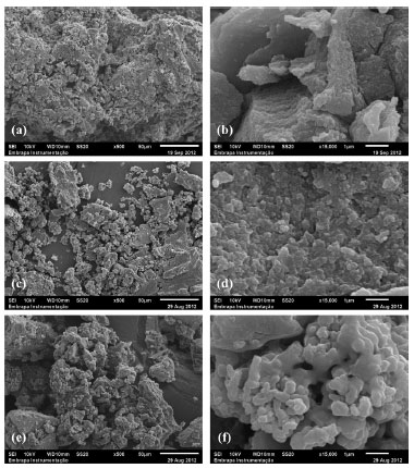 ![]() Figura 2. Micrografias eletrônicas de varredura de (a, b) PANI-DBSA; (c, d) PANI-DBSA-C4MIMBF4(20) e (e, f) PANI-DBSA-C4MIMTf2N(20)