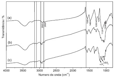 ![]() Figura 4. Espectros na regiao do infravermelho (a) PANI-DBSA; (b) PANI-DBSA-C4MIMBF4(20) e (c) PANI-DBSA-C4MIMTf2N (20) na regiao entre 4000 a 2200 cm-1