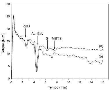 ![]() Figura 6. Curvas de torque de mistura do sistema de vulcanizaçao de blendas de NBR contendo 1% (m/m) de (a) PANI-DBSA-C4MIMTf2N(20) e (b) PANI-DBSA-C4MIMBF4(20). ZnO: Oxido de Zinco, Ac. Est: Acido Esteárico, S: Enxofre e MBTS: 2-mercapto-benzotiazol)