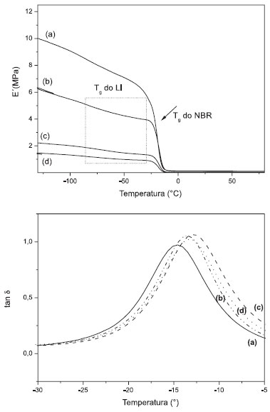 ![]() Figura 7. Curvas de módulo de armazenamento e tan δ para blendas de NBR contendo (a) 15% (m/m) PANI-DBSA; (b) 15; (c) 10 e (d) 5%(m/m) de PANI-DBSA-C4MIMTf2N(20)
