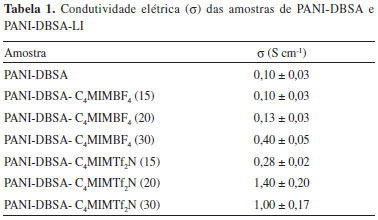RESULTADOS E DISCUSSÃO PANI-DBSA e PANI-DBSA-LI Compósitos de PANI-DBSA com 15, 20 e 30% (m/m) dos dois diferentes líquidos iônicos foram preparados pelo processo mecanoquímico e os valores de condutividade elétrica desses materiais foram avaliados, Tabela 1. Amostras com teores inferiores a 15% (m/m) de LI não foram utilizadas, pois o teor de LI seria inferior a 1% (m/m) na blenda NBR/PANI-DBSA-LI final. Por outro lado, também não se utilizou teores superiores a 30% (m/m), pois a concentração seria alta e o LI deixaria de ser um aditivo e passaria a ser constituinte da blenda.
