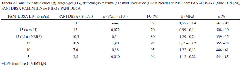 Devido à instabilidade das amostras NBR/PANI-DBSA-C4MIMBF4 frente ao processo de vulcanização, apenas as blendas de NBR com PANI-DBSA-C4MIMTf2N foram preparadas em maiores teores e analisadas. Foram preparadas blendas contendo 5, 10 e 15% (m/m) de PANI-DBSA-BMITf2N(20) e, para comparação, uma amostra contendo 15% (m/m) de PANI-DBSA com e sem a pré-adição de LI na matriz NBR. A Tabela 2 mostra os resultados de condutividade, fração gel, módulo elástico e deformação máxima. Verifica-se que a adição de PANI-DBSA contendo o C4MIMTf2N originou borrachas mais condutoras com menores teores reais de PANI-DBSA. Por exemplo, a blenda que contém 15% (m/m) de PANI-DBSA-C4MIMTf2N (20), que equivale a 10,5% em massa de PANI-DBSA, apresentou valores de condutividade da ordem de 1,90 × 10-5 S cm-1, que é superior em duas ordens de grandeza à blenda que contém 15% (m/m) de PANI-DBSA (0,072 × 10-5 S cm-1) sem adição prévia de LI no NBR. Além de alcançar maiores valores de condutividade elétrica, blendas que contém LI apresentam maiores valores de fração gel, indicando maior reticulação da fase elastomérica. Este comportamento sugere que o LI estabiliza a mistura e impede que a PANI interfira na reticulação da borracha. Estas observações estão em concordância com os resultados de módulo e deformação. Embora os valores de módulo sejam próximos, entende-se que o valor de módulo da blenda de NBR contendo 15% (m/m) de PANI-DBSA é menor comparado àquela que contém LI, pois a quantidade relativa de PANI na amostra NBR/PANI-DBSA-LI é 10,5%. Observa-se, também, que não há variação significativa do módulo em função do teor de PANI nas formulações que contém o LI. Os valores de deformação máxima mostram que para amostras que contém líquido iônico os valores diminuem com o aumento de PANI-LI, o que é esperado considerando o efeito de reforço. Entretanto, para amostras contendo apenas PANI-DBSA o valor de deformação é alto. Este resultado está relacionado com o teor de NBR não reticulado, como mostrado pelos resultados de fração gel.