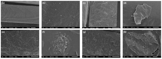 Figura 8. Micrografias eletrônicas de varredura de fratura de (a, b) NBR puro e de blendas de NBR com 15% (m/m): (c, d) PANI-DBSA; (e, f) PANI-DBSA-C4MIMTf2N(20) e (g, h) PANI-DBSA (4,5% de C4MIMTf2N no NBR)