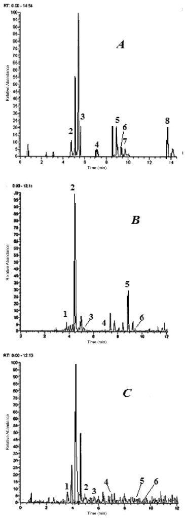 ![]() Figure 1. HPLC/PDA chromatogram of ethyl acetate extract of floral parts of M. grandiflora: A, stamen; B, gynoecium; C, petal