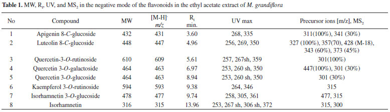 RESULTS AND DISCUSSION Qualitative detection of the flavonoids in the ethyl acetate fraction was performed by TLC and subsequently by HPLC-PDA. The HPLC chromatogram (Figure 1) revealed that methanolic acetonitrile with 0.1% formic acid gave the best separation of the flavonoid peaks.16 In the present work, a gradient flow was used to elute the polar compounds with reasonable resolution. The mobile phase applied in this experiment was the most suitable for the investigation of the C-glycosides vitexin (1) and orientin (2), where their peaks showed a relative retention greater than 1. They were characterized on the bases of their product ion spectra, comparisons with reference samples, and literature data.17 TIC of LC-MSn (n = 2) chromatograms detected another six flavonols: O-glycosides (3 - 7) and O-methylated aglycone (8). A comparison of the retention times, UV and mass spectra of the deprotonated molecule [M-H] - of glycosides and the ion corresponding to the deprotonated aglycone [A-H] - with data compiled for known standards confirmed their identification as rutin (3), nicotiflorine (4), hyperoside (5), isoquercetrin (6), and isorhamnetin (8). Isorhamnetin (8) exhibited a specific fragmentation because of the loss of 15 units of the methyl radical to give m/z 300. The identification of compound 7 was supported by the loss of 162 units from the pseudomolecular ion m/z 477 [M-H]-. The MS2 product-ion analysis of the parent ion provided a fragmentation pattern of isorhamnetin glucoside, similar to the results previously reported in the literature.18 The molecular ion at m/z =315 was suitable for the identification of isorhamnetin (Table 1).