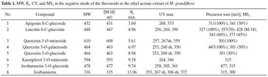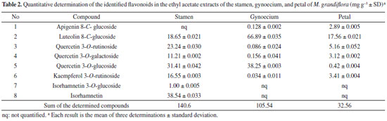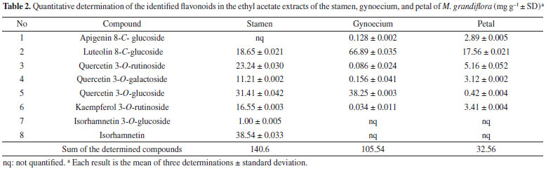 Validation data All the references standards (vitexin, orientin, rutin, nicotiflorine, hyperoside, and isorhamnetin) showed linearity (r2 = 0.985, 0.999, 0.951, 0.9437, 0.975, and 1, respectively) in a relatively different and wide concentration range. The RSD values of the inter-day precision experiments were 1, 1.88, 1.35, 2.14, 2.11, and 2.32%, respectively, and the intra-day variations were 2.04, 1.01, 1.10, 2.67, 1.89, and 2.11%, respectively. Their average regression equations were: y = 0.119 + 462785x (vitexin); y = 0.369 + 137922x (orientin); y = 0.5612x + 0.0457 (rutin); y = 0.3393x - 0.6307 (nicotiflorine); y = 0.0851x + 0.1497 (hyperoside); and y = 1.7831x - 0.1302 (isorhamnetin). The accuracy was determined by calculating the recovery values for each of the quantified flavonoids and was found to be 96.65 ± 0.64%, 96.53 ± 3.22%, 98.21 ± 2.45%, 99.34 ± 2.23%, 96.89 ± 3.43%, and 94.45 ± 1.34%, respectively. The limits of detection were 7.14 (vitexin), 2.22 (orientin), 5.46 (rutin), 7.58 (hyperoside), 5.21 (nicotiflorine), and 5.83 (isorhamnetin). The identified compounds in the extracts of the floral parts of M. grandiflora L. were quantified by HPLC-PDA. The results (Table 2) show that the stamen extract contained the largest amounts of the identified flavonoids (ca. 140.6 mg g-1). Orientin was present in the highest concentration (ca. 66 mg g-1) and was mainly concentrated in the gynoecium. To the best of our knowledge, this study represents the first report of the presence of these flavonoids in the stamen, gynoecium, and petal of the M. grandiflora L.