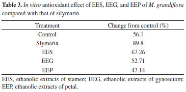 CONCLUSION An investigation of the stamens, gynoecia, and petals of the flower of M. grandiflora was conducted for the first time and led to the identification of six flavonols in addition to vitexin and orientin. The ethanolic extracts of the organs under investigation exhibited bioactivities when examined for their antioxidant and hepatoprotection effects. The stamen extract exhibited a higher potency because of its total flavonoid content; these flavonoids exhibit hydrogen-donating-antioxidant activity and the ability to bind divalent metal cations.
