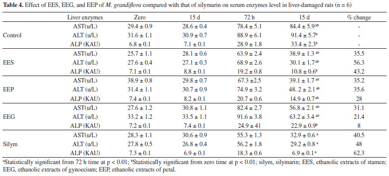 Hepatoprotection effect The results in Table 4 reveal that the administration of CCl4 induced acute liver toxicity, as evident from the increased levels of AST, ALT, and ALP. However, administration of doses of the test extracts under investigation or silymarin significantly preserved biochemical changes during CCl4 intoxification and confirmed their potential hepatoprotection activity to regenerate liver parenchyma cells. The results showed that EES was the most potent; it induced percentage decreases in the AST, ALT, and ALP levels of 56.3, 43.2, and 35.2%, respectively.