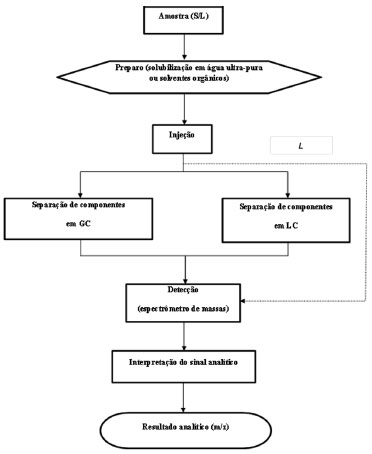 ![]() Figura 3. Fluxograma simplificado da aplicação da espectrometria de massas para a identificação estrutural de compostos orgânicos em amostras líquidas (L) e sólidas (S), acoplada a sistema de separação por cromatografia líquida (LC, liquid chromatography) ou cromatografia gasosa (GC, gas chromatography)