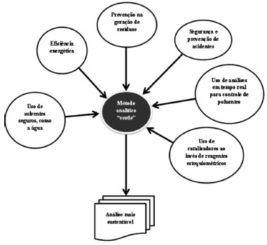 ![]() Figura 4. Aplicação de conceitos de química verde para o desenvolvimento de um método analítico"verde" e sua implicação na melhoria na sustentabilidade de um processo analítico, sendo que tal sustentabilidade considera impactos ambientais, impactos econômicos e impactos sociais; neste caso é considerada somente a componente ambiental