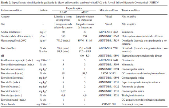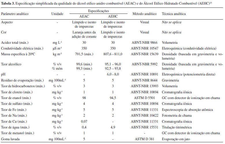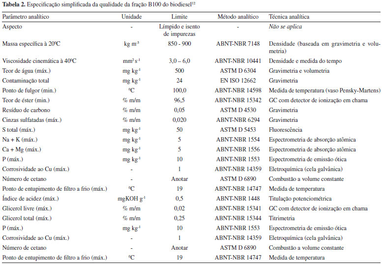 Controle de qualidade Para o controle de qualidade do produto final é comum que haja a necessidade de realização de um número elevado e variado de análises químicas de forma que estas atendam a parâmetros físico-químicos de qualidade, muitas vezes estabelecidos por legislação reguladora. As Tabelas 2 e 3 mostram o uso de técnicas analíticas no controle de qualidade do biodiesel e do etanol, respectivamente, enquanto que a Figura 3 apresenta o fluxograma da aplicação da espectrometria de massas acoplada a técnicas cromatográficas de separação, as quais podem ser utilizadas nas etapas de análise da composição e caracterização da matéria-prima.