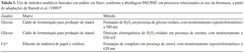 Conforme já comentado, as fontes de biomassa e sua composição são bastante heterogêneas, além do fato de que as pesquisas para o seu uso geralmente buscam o desenvolvimento de tecnologias inovadoras para o aproveitamento de todo o potencial da biomassa, desde o energético até o de produção de compostos químicos. Isto implica que o uso de uma técnica depende em muito da necessidade analítica surgida durante a atividade experimental (ex.: identificação de produtos e subprodutos de um processo inovador). Pode-se citar neste contexto pesquisas visando à obtenção de biocombustíveis de segunda geração, de produtos de gaseificação da biomassa e de produtos químicos derivados da lignina e da hemicelulose. Cabe destacar que na atualidade o uso de técnicas hifenizadas em áreas como a pesquisa de efluentes tem mostrado ganho em separação e detecção.25 Estas técnicas caracterizam-se pela união de duas ou mais técnicas analíticas (ex.: microextração em fase sólida-GC-espectrometria de massas), o que pode otimizar o tempo de preparo das amostras e os custos envolvidos. Certamente, tais técnicas já são também de grande utilidade em pesquisas sobre a biomassa e terão um uso maior conforme haja o aparecimento de novos desafios no que diz respeito aos processos de produção e de análise. A química analítica de processos A necessidade de um controle de qualidade dos processos químicos e bioquímicos de produção levou à criação do termo química analítica de processos ou PAC (process analytical chemistry), muitas vezes também chamado de tecnologia analítica de processos ou PAT (process analytical technology). Como uma área de pesquisa e aplicação, privilegia-se o uso de técnicas e métodos robustos, preferencialmente em tempo real durante a operacionalização do processo (on-line), com as análises sendo realizadas diretamente no reator, ao invés de análises realizadas em laboratório.26,27 A principal vantagem deste tipo de abordagem analítica em relação à tradicional, na qual é realizada a amostragem seguida do transporte da amostra e posterior análise em laboratório, é que análises realizadas in situ proporcionam maior rapidez para a tomada de ações corretivas e consequente ajuste do processo de desenvolvimento ou de produção, quanto este apresentar não conformidades técnicas, como no caso dos processos de fermentação e destilação do etanol e de transesterificação do biodiesel, nos quais variáveis como temperatura, valor de pH, pressão, formação de produtos e subprodutos, entre outros, devem ser monitoradas para garantir a qualidade do produto final. Contudo, a necessidade de se ter instrumentação analítica robusta, como sensores eletroquímicos de simples uso e automatizados, acaba limitando o número de parâmetros analíticos possíveis de serem analisados, além dos limites de detecção e de quantificação - LD e LQ, respectivamente - que dificilmente atingem valores de laboratório. Porém, o contínuo desenvolvimento de novas tecnologias analíticas e de novos materiais certamente aumentará as possibilidades de obtenção de mais resultados, tanto por aceitar maior variação nas condições físico-químicas do meio, quanto por permitir uma melhor identificação de compostos químicos. Neste último caso, por exemplo, por meio da utilização de detectores como os de absorção no UV/visível e no infravermelho médio e próximo.27 Aplicações da abordagem PAC/PAT a partir do uso de métodos de análise em fluxo podem ser observadas na Tabela 5 para processos químicos e bioquímicos. A análise em fluxo é uma técnica que permite a realização de análises in situ no modo on-line real; ou seja, seus métodos podem atender bem ao conceito PAC/PAT apresentado acima.