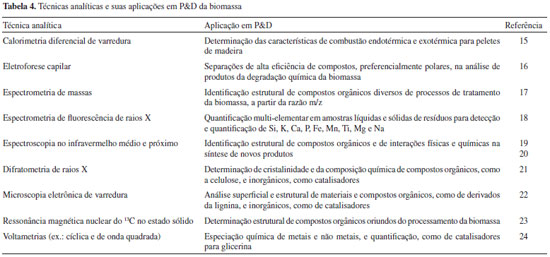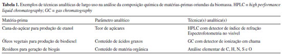 A seguir são tratados exemplos de aplicações analíticas, de acordo com diferentes necessidades de exame da biomassa e produtos, além de comentadas algumas tendências tecnológicas. Determinação da composição de matérias-primas Para a análise da composição química de matérias-primas oriundas da biomassa geralmente são utilizadas técnicas analíticas que forneçam uma resposta rápida (menor período de tempo entre a realização da medida e a obtenção do resultado), já que os resultados levarão ao aceite ou não do material dentro do processo de produção, tendo implicações financeiras diretas para as etapas iniciais de processamento das cadeias produtivas. A Tabela 1 apresenta alguns exemplos de uso de técnicas analíticas com este fim.