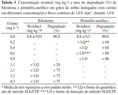 Estes resultados se devem ao elevado potencial oxidativo do ozônio, o qual tem sido relatado em diversos estudos como altamente eficiente na degradação de resíduos de agrotóxicos, em diferentes produtos.14,15,38-40 O ozônio possui grande afinidade com estruturas moleculares compostas por duplas ligações.41,42 A estrutura molecular tanto da bifentrina como do pirimifós-metílico é composta por um grande número de ligações deste tipo, o que favorece o processo de quebra das moléculas e consequentemente a degradação pelo ozônio. Os resultados demonstram que o processo de degradação do pesticida se intensifica à medida que se aumenta a concentração do gás. A este respeito, relata-se que o aumento na concentração do ozônio pode promover aumento na eficiência do processo de degradação de resíduos de agrotóxicos. 41,43 Isso ocorre devido ao aumento no número de moléculas do O3 e/ou radicais livres (O• - produzidos pela quebra da molécula O3) disponíveis no meio, os quais interagem com as moléculas dos agrotóxicos e ocasionam sua quebra.42